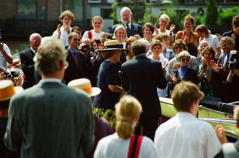 Koningin Beatrix bij de 150-jarige Koninklijke Amsterdamsche Roei- en Zeilvereeniging 'De Hoop'.